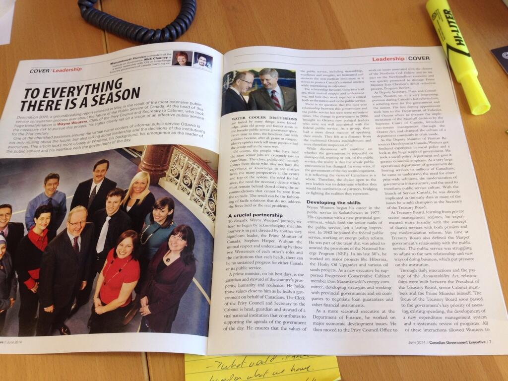 I co-wrote this month's Canadian Government Executive Magazine cover story with the Institute on Governance's Maryantonett Flumian; the article explores the relationship between the Clerk of the Privy Council Wayne Wouters and Prime Minister Stephen Harper. Here's an excerpt: